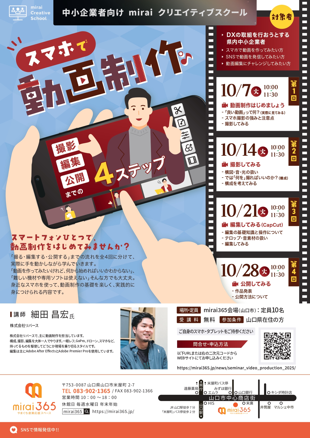 「撮る・編集する・公開する」までの流れを全4回に分けて、実際に手を動かしながら学んでいきます。